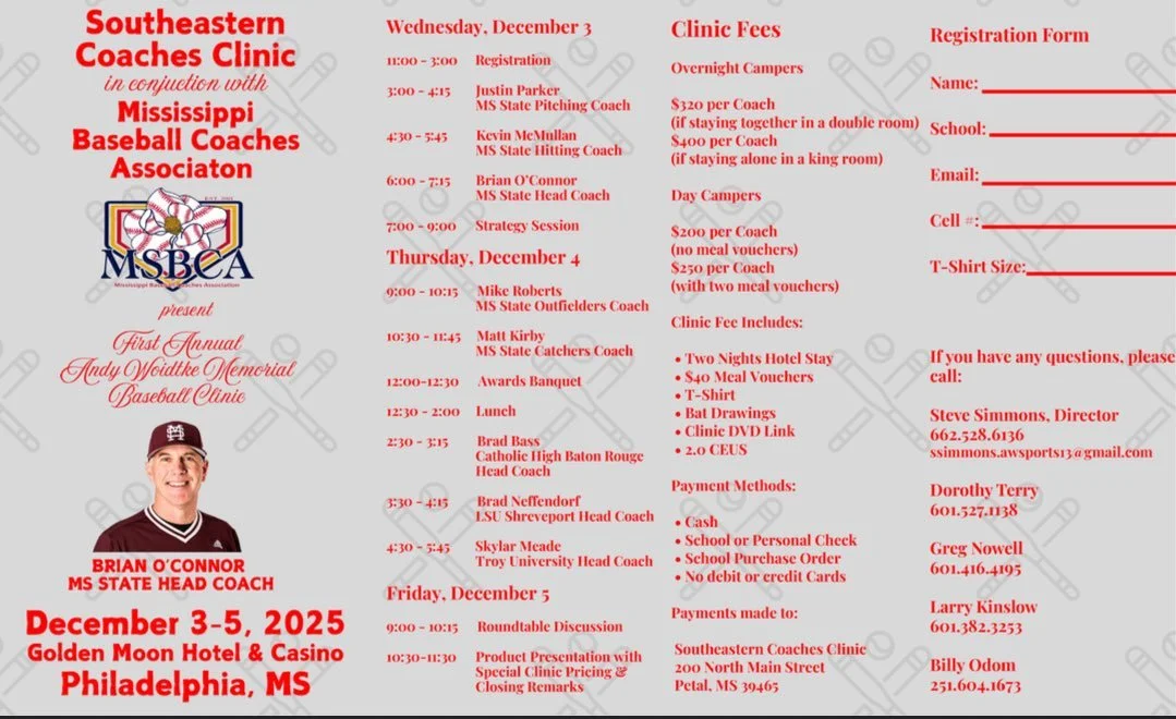 MSBCA is proud to partner with the Southeastern Coaches Clinic to present TheFirst Annual Andy Woidtke Memorial Baseball Clinic at the Golden Moon Hotel and Casino in Philadelphia, Ms. (Dec. 3rd, 4th, 5th)